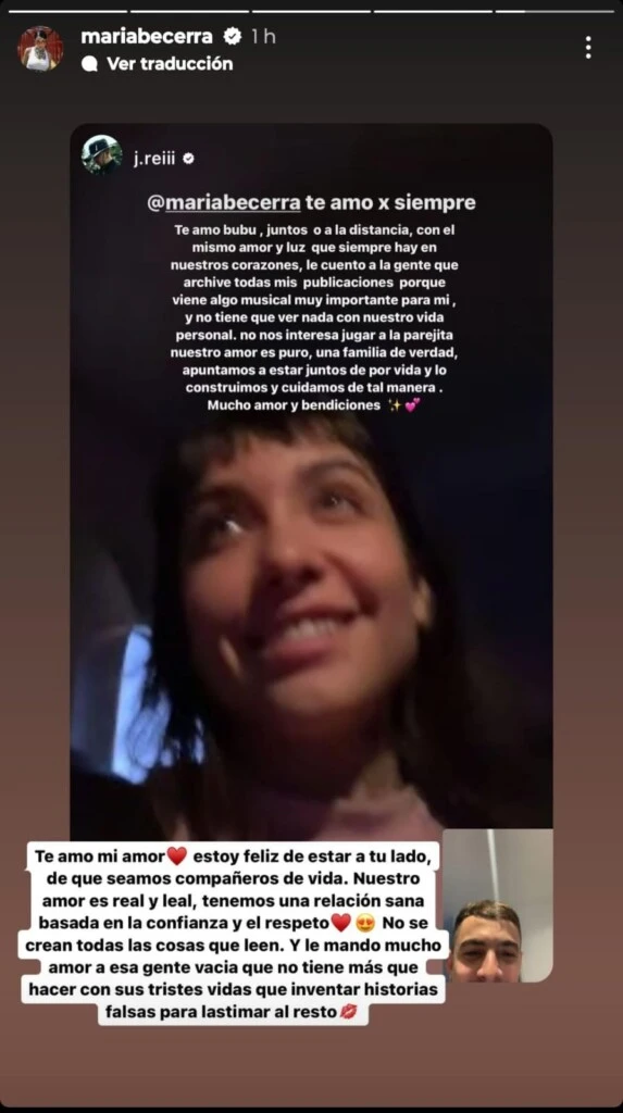 Minutos después su pareja posteó una imagen donde aparecían hablando por videollamada como una señal de que estaba todo bien entre ellos y escribió en sus historias de Instagram: "Te amo por siempre. Te amo bubu, juntos o a la distancia, con el mismo amor y luz que siempre hay en nuestros corazones", comenzó diciendo.