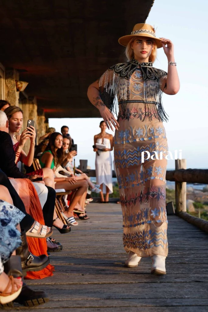 En su primer desfile Marta lució un outfit boho chic con transparencias, botas texanas blancas y un sombrero estilo cowboy.