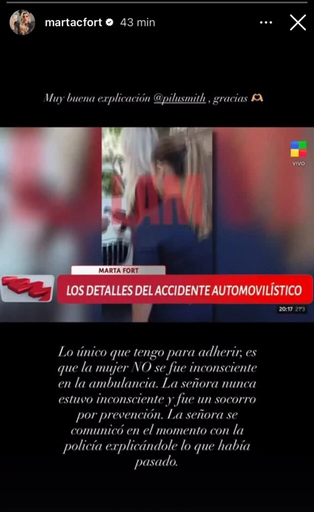 El posteo de Marta Fort marcó su primera aparición pública tras el episodio y tuvo como objetivo precisar información clave sobre el estado de la mujer atropellada, en medio de la atención mediática que rodeó el caso.