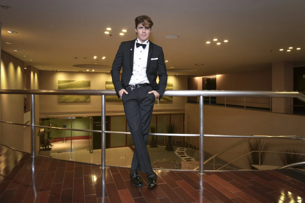 Para este gran evento el joven utilizó un tuksido en lana super 150 de corte italiano, con una camisa de algodón con cuello pajarita, moño y un cinturón de charol. Los zapatos a juego eran de Salvatore Ferragamo. Un "total look de Fabián Zitta", como se lo señaló a GENTE.
