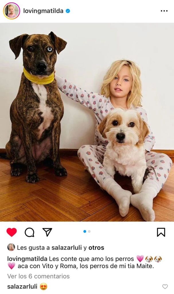 El más pequeño de ellos, Vito, es adoptado y Matilda comparte imágenes con él en sus redes desde el 2021. "Amo mucho a Vito", aseguró la niña. Generalmente, los fines de semana, Luli y su hija van a pasar el día en casa de sus abuelos y allí la nena se reencuentra con sus queridos compañeritos de cuatro patas.