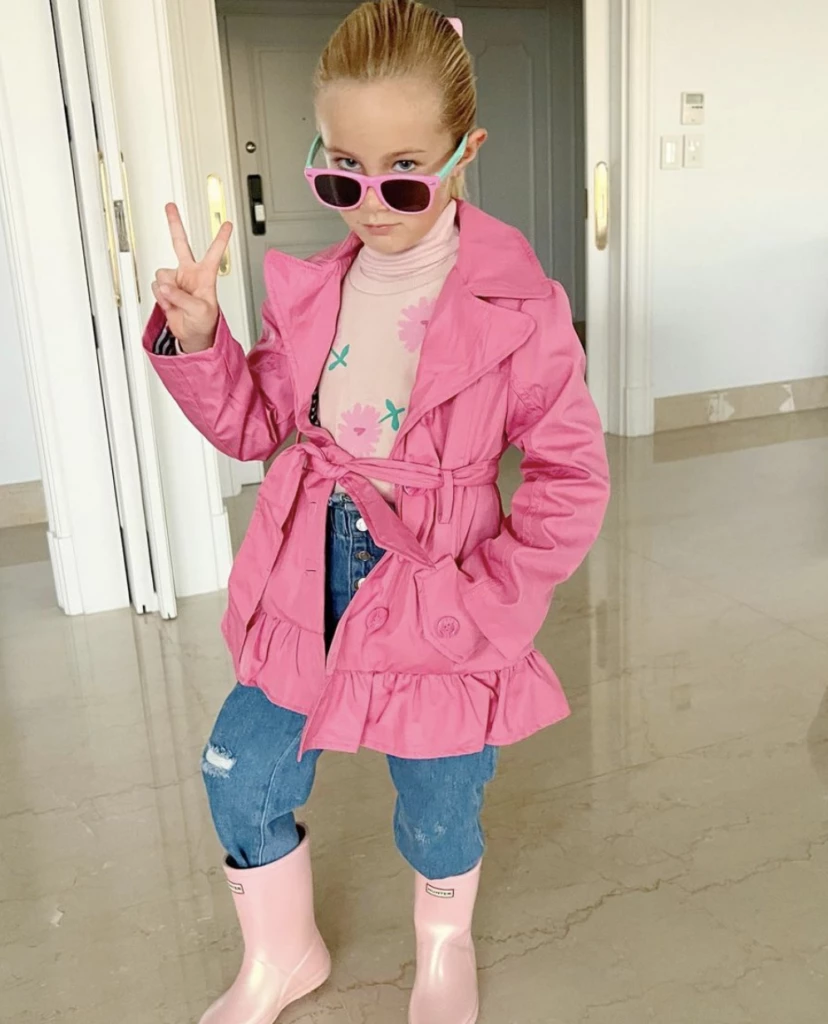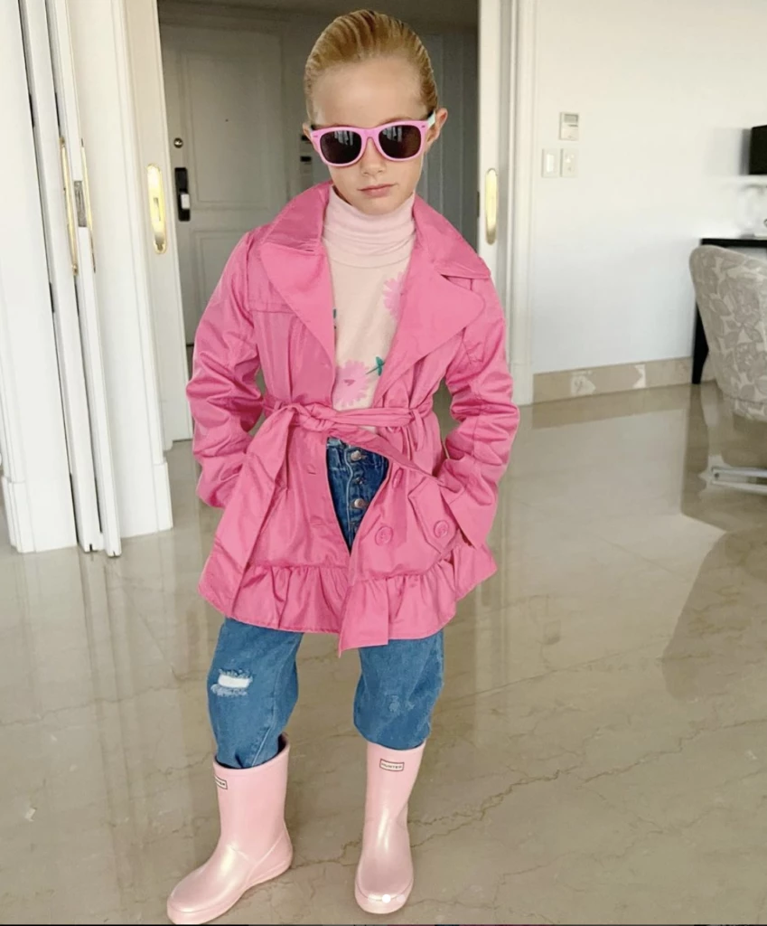 Siempre canchera, Matilda Salazar posó para su mamá con las infaltables anteojos de sol, a tono con su abrigo estilo trench fucsia con volados. De la misma manera, la hija de Luciana combinó sus botas de lluvia con una polera con estampado floral, ambas a juego en el mismo tono de rosa palo.