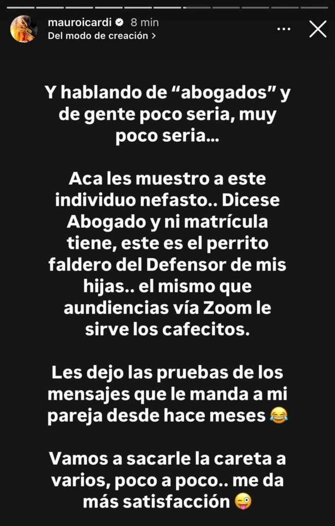 Luego de su descargo cuestionando a Wanda y a su defensa, Mauro subió una historia en la que apuntó: "Y hablando de 'abogados' y de gente poco seria, muy poco seria... Acá les muestro a este individuo nefasto. Dícese abogado y ni matrícula tiene, este es el perrito faldero del Defensor de mis hijas... El mismo que audiencias vía zoom le sirve los cafecitos".