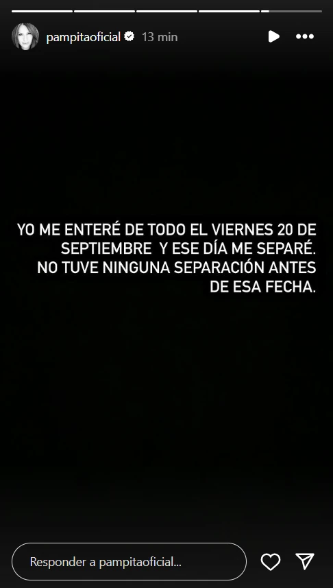 "Yo me enteré de todo el viernes 20 de septiembre y ese día me separé. No tuve ninguna separación antes de esa fecha", escribió la modelo en sus historias de Instagram sobre una placa negra que compartió en la tarde del sábado.