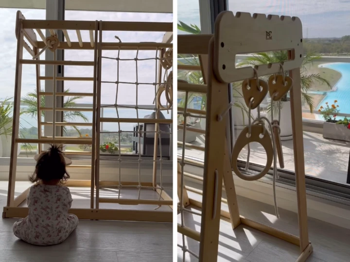 Se trata de un gimnasio, con el que busca ayudar a su hija en el desarrollo de sus habilidades motoras gruesas, la fuerza, la motivación y la independencia.