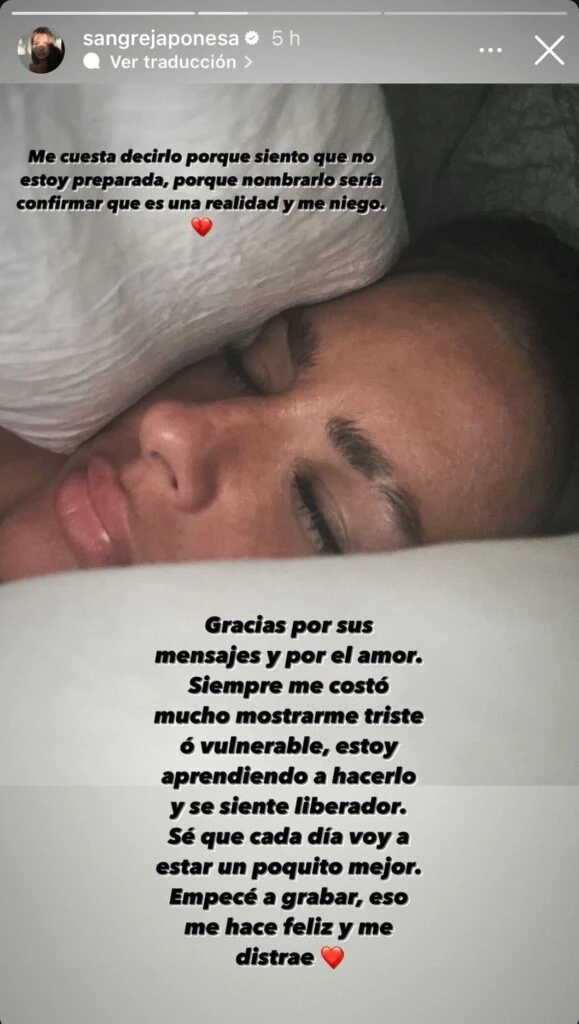 Y añadió: "Gracias por sus mensajes y por el amor. Siempre me costó mucho mostrarme triste o vulnerable, estoy aprendiendo a hacerlo y se siente liberador", confesó la actriz. Y para cerrar, expresó: "Sé que cada día voy a estar un poquito mejor. Empecé a grabar, eso me hace feliz y me distrae".