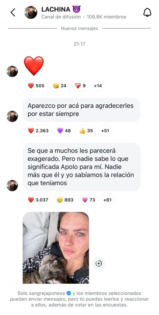 Este miércoles a la noche, Eugenia China Suárez sorprendió a sus más de 109 mil miembros de su canal de difusión de Instagram con varios posteos que reflejaban su profunda tristeza por la muerte de Apolo, su perrito de 13 años que falleció en las últimas horas.