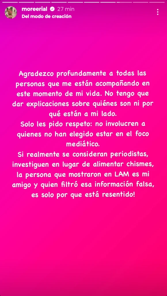 Más adelante puso: "No tengo que dar explicaciones sobre quiénes son ni por qué están a mi lado. Solo les pido respeto: no involucren a quienes no han elegido estar en el foco mediático". Y siguió: "Si realmente se consideran periodistas, investiguen en lugar de alimentar chismes".