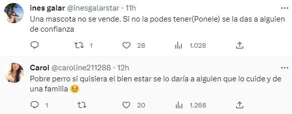 "Una mascota no se vende. Si no la podes tener, ponele, se la das a alguien de confianza", planteaba una usuaria públicamente sobre Morena Rial. Otra persona reflexionó: "Pobre perro si quisiera el bienestar se lo daría a alguien que lo cuide y de una familia".