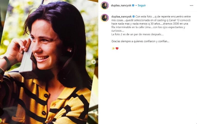En esa red social, Nancy Dupláa escribió: "Con esta foto que de repente encuentro entre mis cosas, quedé seleccionada en el casting que Canal 13 convocó hace nada más y nada menos que 30 años. Éramos 3500 en una fila interminable en la calle Lima… con los ojos expectantes y curiosos… Gracias siempre a quienes confiaron y confían".