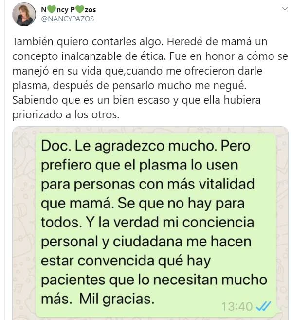 Hasta ahí fue la despedida esperable de una persona mediática. Sin embargo, en su cuenta de Twitter la periodista agregó más información: "Fue en honor a cómo se manejó en su vida que, cuando me ofrecieron darle plasma, después de pensarlo mucho me negué".