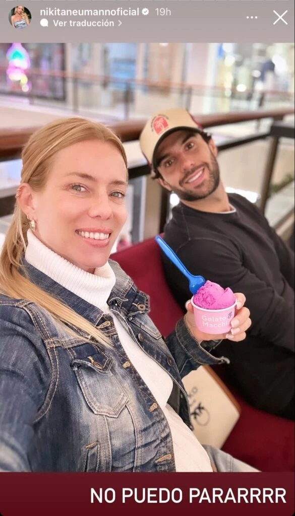 En otra historia de Instagram, Neumann mostró en detalle el postre con el que quedó encantada. En el envase se puede leer "helado del paraíso". También ella agregó: "modo rosa". Por su parte, el corredor de autos escribió en broma: "Acá con la Pac-girl".