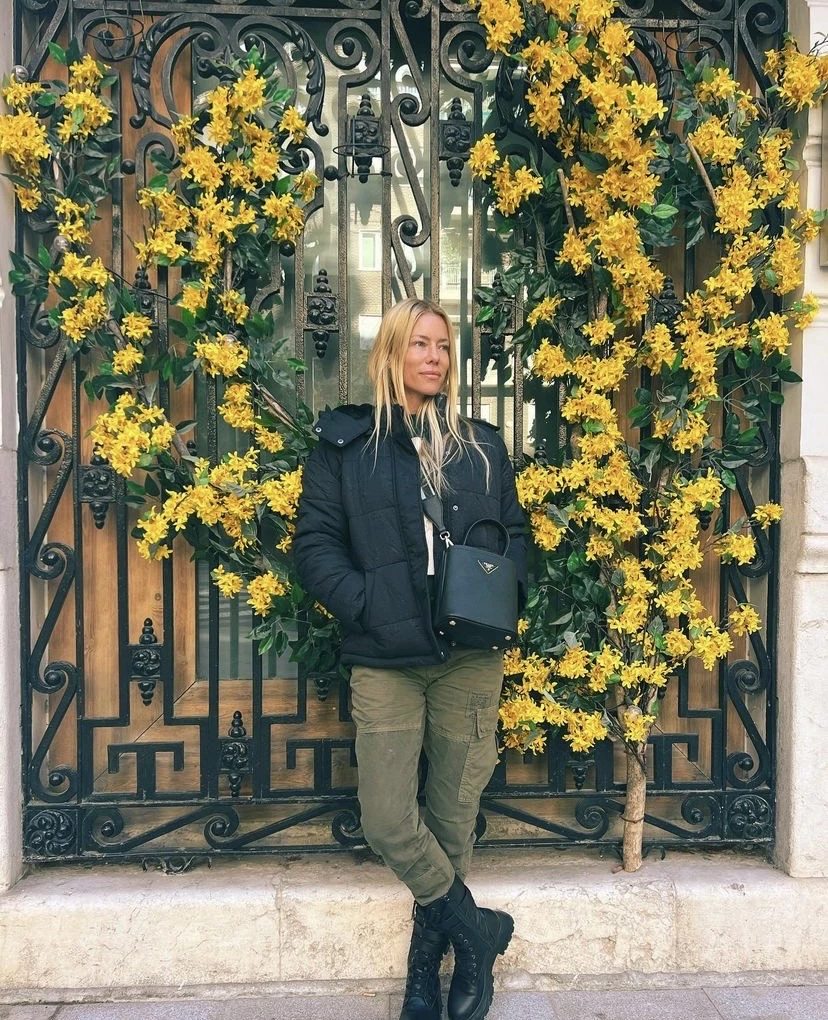 Siempre dando cátedra de moda, la modelo eligió un outfit cancherísimo que podriamos denominar militar chic: pantalón cargo verde (con bolsillos a los costados, es lo último en materia de moda) y lo combinó con campera puffer y borcegos negros.