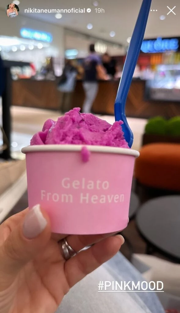En otra historia de Instagram Neumann mostró en detalle el postre con el que quedó encantada. En el envase se puede leer "helado del paraíso". También ella agregó: "modo rosa". Por su parte, el corredor de autos escribió en broma: "Acá con la Pac-girl".