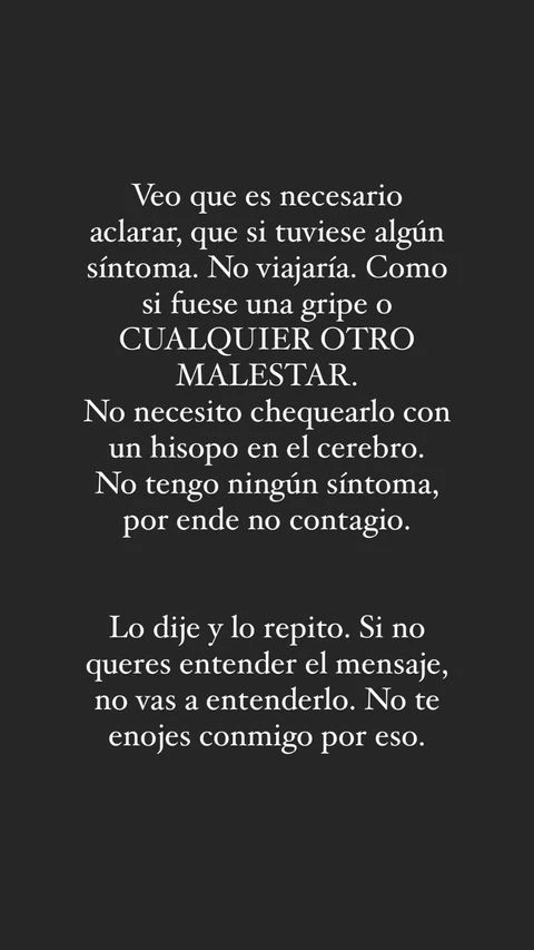 Por último, fiel a su pensamiento sumó: “No viajaría si tuviera algún síntoma. No está chequeado que el coso ese que te meten en la nariz confirme realmente si tenés o no este bicho. Te lo cobran, es otra ganancia para este sucio sistema”, concluyó.