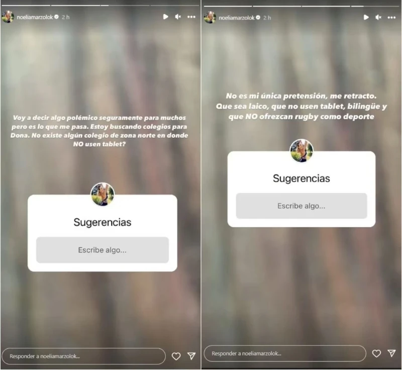 La bailarina, subcampeona de la última edición del Bailando, planteó su inquietud a través de sus historias de Instagram, y además lanzó unas exigencias que tiene ella para con el colegio. "Que sea laico, que no usen tablet, bilingüe y que NO ofrezcan rugby como deporte", añadió, al mismo tiempo que abría el box de preguntas para escuchar las sugerencias de sus seguidores.