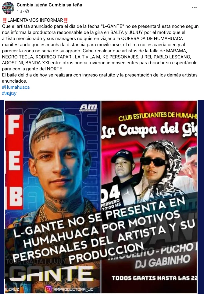 Junto al flyer de dicho evento, escribieron: "Lamentamos informar que el artista anunciado para el día de la fecha, L-Gante, no se presentará esta noche según nos informa la productora responsable de la gira en Salta y Jujuy".