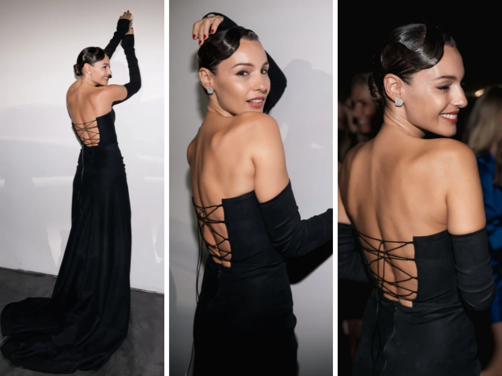 Asimismo, el famoso estilista de las estrellas más importantes del país remarcó que la idea también era que se luzca el vestido, que ceñía a la perfección a la modelo, compuesto por una especia de corset arriba, que complementó con unos largos guantes a tono, muy característicos del viejo Hollywood.