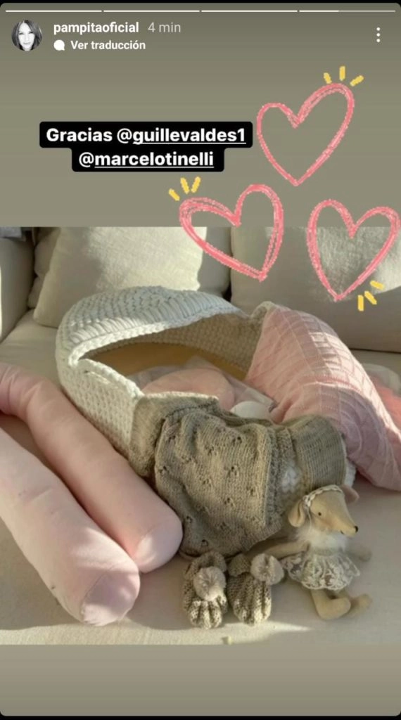 La presentadora, que planea volver en unos días a ocupar su asiento en el jurado de La Academia de ShowMatch (el trece), mostró en sus stories de Instagram un tierno kit para Ana donde se observa un moisés tejido en color blanco, dos mantas (una rosa y una marrón), tres almohadones rosas (dos largos y uno redondo), un peluche y un par de escarpines. Un kit ideal para el invierno que todavía resta pasar en Buenos Aires hasta la llegada de la primavera en septiembre.