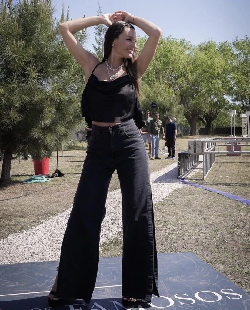 La conductora de El hotel de los Famosos 2 lució un outfit súper canchero y sofisticado en el programa que conduce al Chino Leunis en eltrece. Pampita lució un top negro de satén -con breteles finitos- y jeans negros con tajos a los costados.