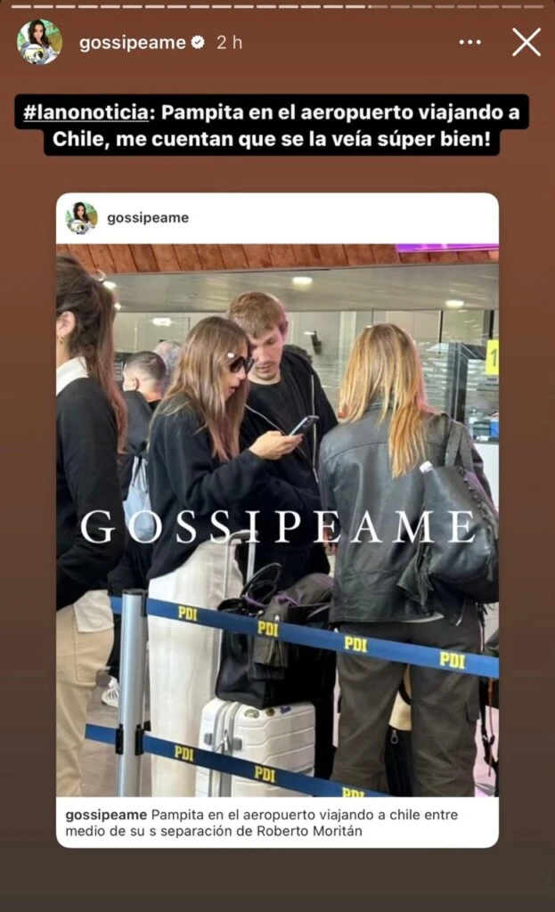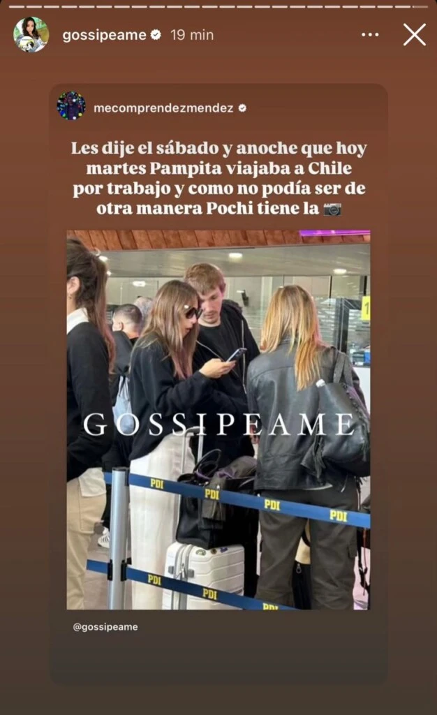 Rápidamente, este contenido comenzó a viralizarse, y un colega de Pochi, Gustavo Méndez reveló: "Les dije el sábado y anoche que hoy, martes, Pampita viajaba a Chile por trabajo y como no podía ser de otra manera, Pochi tiene la foto".