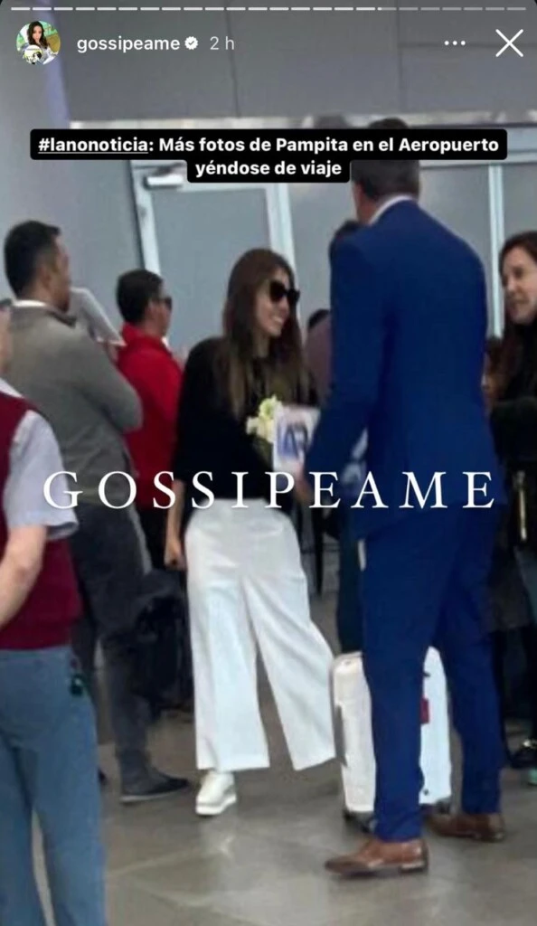 Este martes por la mañana, la influencer Pochi compartió en su cuenta de Instagram, @Gossipeame, una postal en la que se la ve a Pampita en la fila del check in del aeropuerto. En la imagen, la modelo está mirando su celular con su peluquero, Valentín Epinal, ambos con cara de sorprendidos. Junto a ella se ve una carry on blanca y un bolso negro con los que estaba viajando.