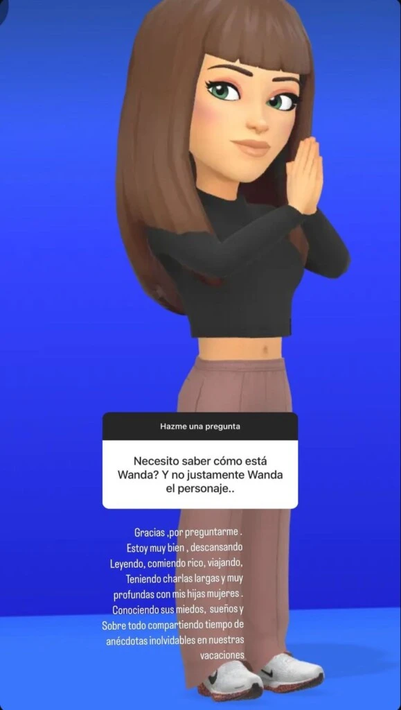 Otro curioso usuario le consultó: "Necesito saber cómo está Wanda y no justamente el personaje...". "Gracias por preguntarme. Estoy muy bien. Descansando, leyendo, comiendo rico, viajando, teniendo charlas largas y muy profundas con mis hijas mujeres", le respondió la animadora de Telefe.