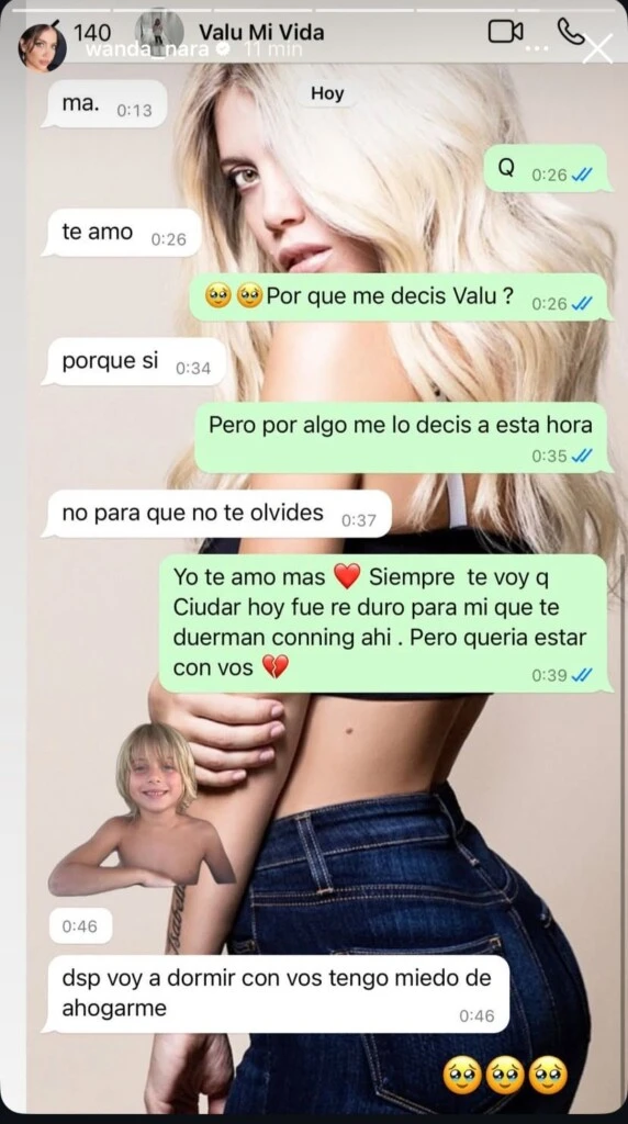 Minutos después de la respuesta de su mamá, Valentino sumó un sticker suyo de niño sonriendo y escribió: "Después voy a dormir con vos. Tengo miedo de ahogarme". Ante esto, Wanda sumó una serie de emojis con ojos llorosos.