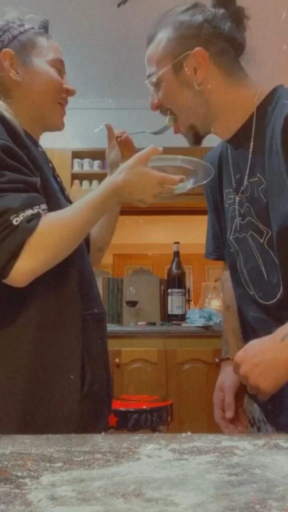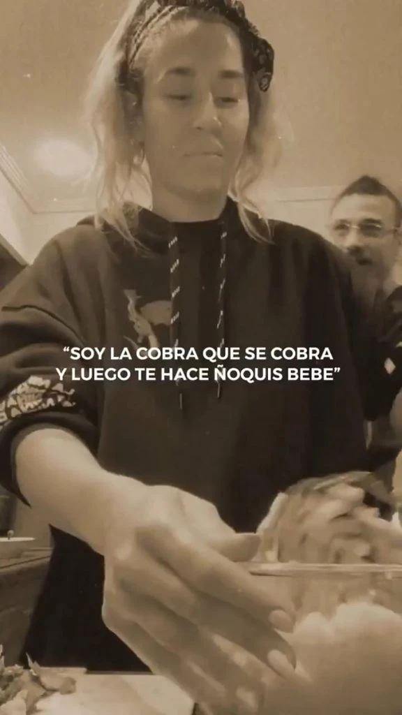 Después, su hijo, Momo, se sumó a ayudar mientras Daniel servía vino tinto en una jarra. Y, mientras ella le ponía sal al puré, de la nada, Daniel cantó: "Soy la cobra que se cobra y luego te hace ñoquis bebe" modificando ampliamente la letra original que escribió Barón a principios del 2019 que dice: "Soy la cobra que se cobra todo lo que hiciste bebe".
