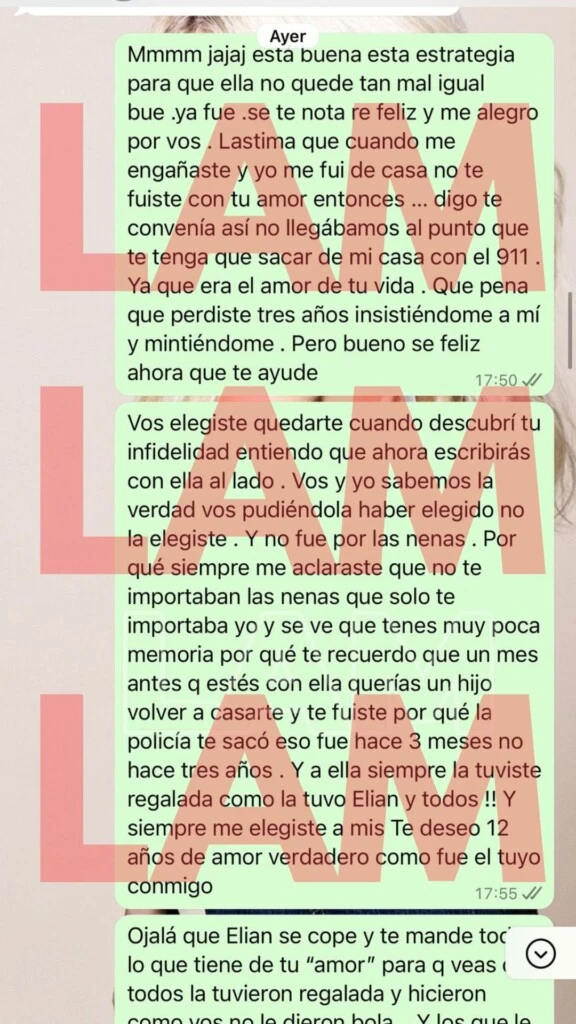 Luego, agregó: "Vos elegiste quedarte cuando descubrí tu infidelidad. Entiendo que ahora escribirás con ella al lado. Vos y yo sabemos la verdad, vos pudiéndola haber elegido no la elegiste. Y no fue por las nenas, por qué siempre me aclaraste que no te importaban las nenas, que sólo te importaba yo".