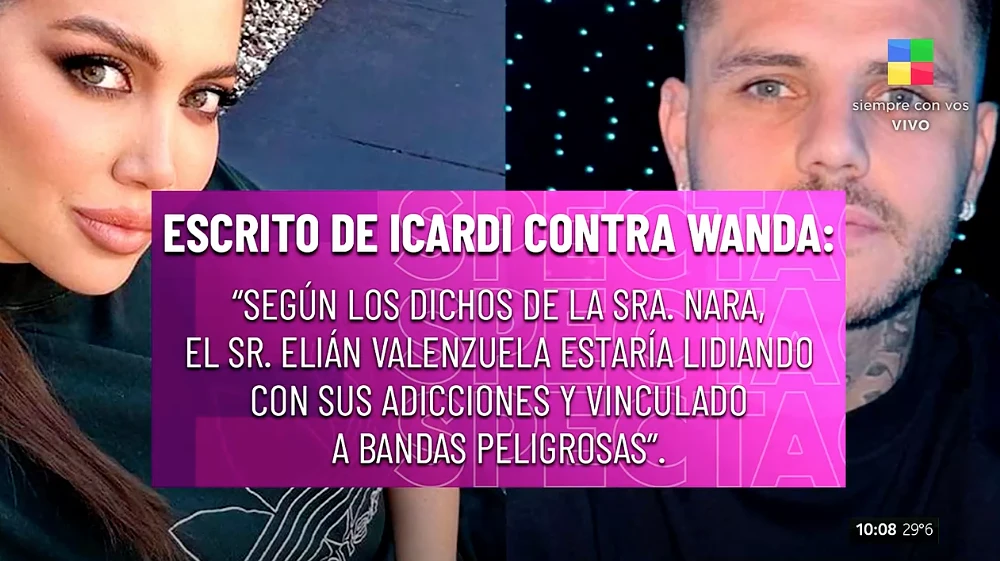 Ante esto, en Lape Club Social (América TV), Marina Calabró reveló que esta imagen despertó el enojo de Icardi, quien le solicitó a sus abogadas que realizaran un escrito denunciando estos hechos. En ese momento, la panelist leyó un textual del escrito: "Según los dichos de la Sra. Nara, el Sr. Elián Valenzuela estaría lidiando con sus adicciones y vinculado a bandas peligrosas".