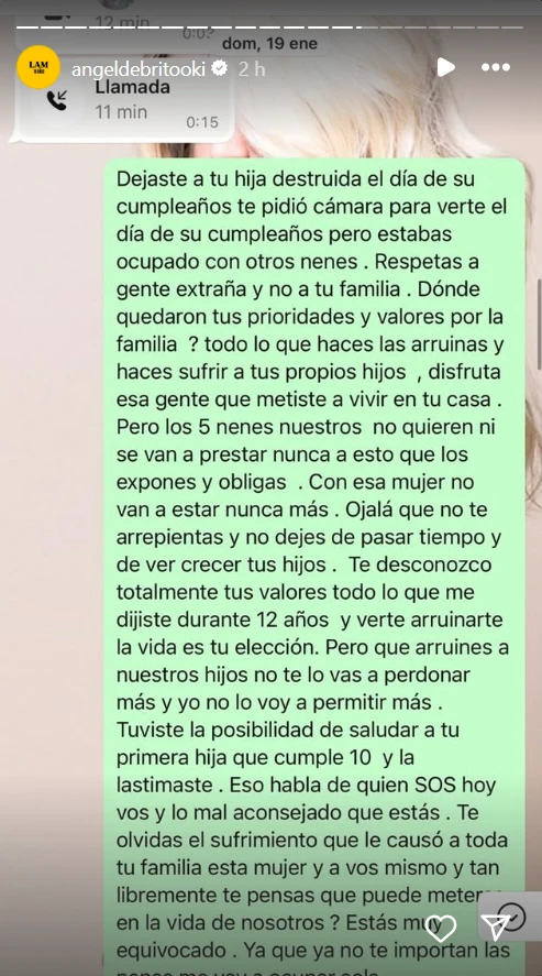 Y siguió: "¿Dónde quedaron tus prioridades y valores por la familia? Todo lo que hacés las arruina y hacés sufrir a tus propios hijos. Disfrutá esa gente que metiste a vivir en tu casa, pero los cinco nenes nuestros no quieren ni se van a prestar nunca a esto que los expones y obligas“.