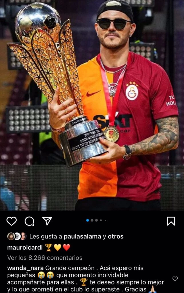 "Grande, campeón", escribió lacónica. Enseguida también se pronunció en el carrusel de fotos con el que el goleador festejó el triunfo del Galatasaray pero remarcando muy claramente su rol de madre y manager. "Acá espero a mis pequeñas. Qué momento inolvidable para ellas. Te deseo siempre lo mejor y lo que prometí en el club, lo superaste. Gracias".