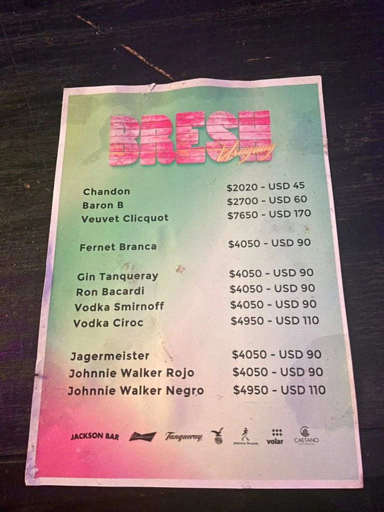 La bebida más económica de La Bresh es el espumante individual de la marca Chandon de $2020 o USD 45. Le sigue el Barón B de $2700 el equivalente a USD 60 y el Veuvet Clicquot de $7650 o USD 170. El Fernet Branca uno de los tragos argentinos más solicitados cuesta $4050 igual a USD 90.