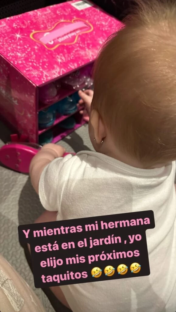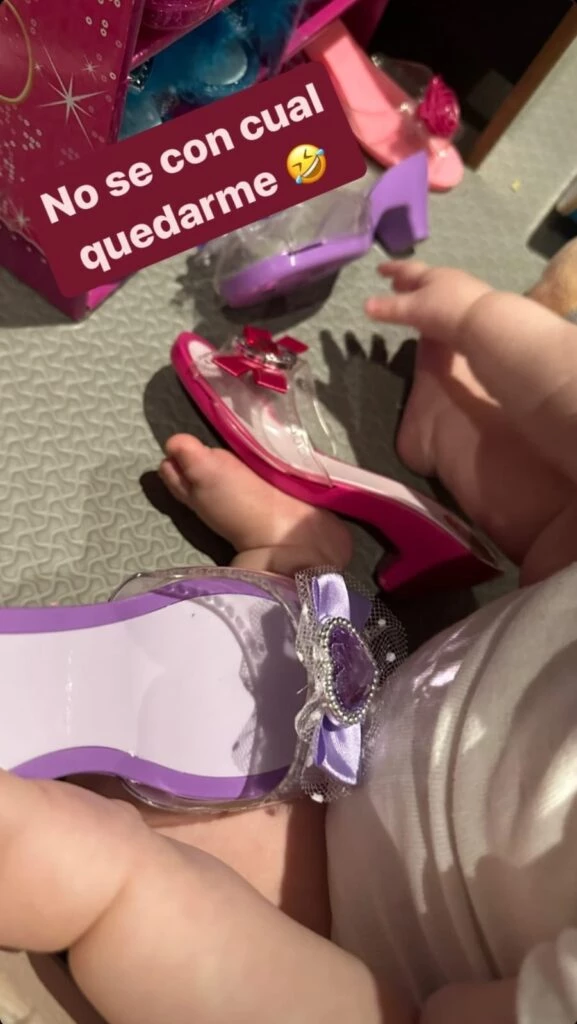 "Y mientras mi hermana está en el jardín, yo elijo mis próximos taquitos", dijo la Dalma, mostrando como la nieta más pequeña del 10 desordenaba el guarda zapatos de Roma. "No sé con cuál quedarme", agregó la actiz mostrando que la bebé de un año tenía en sus manos unos tacos rosas y otros violeta.
