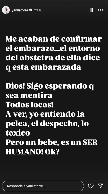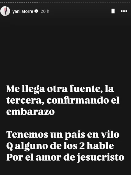 A las pocas horas, comenzó a revelar más detalles, ya que recibió una nueva confirmación de la información del embarazo. "Me llega otra fuente, la tercera, confirmando el embarazo", escribió por la noche, y luego subió otra historia que decía: "Cuarta fuente confirmando el embarazo, ampliaremos".