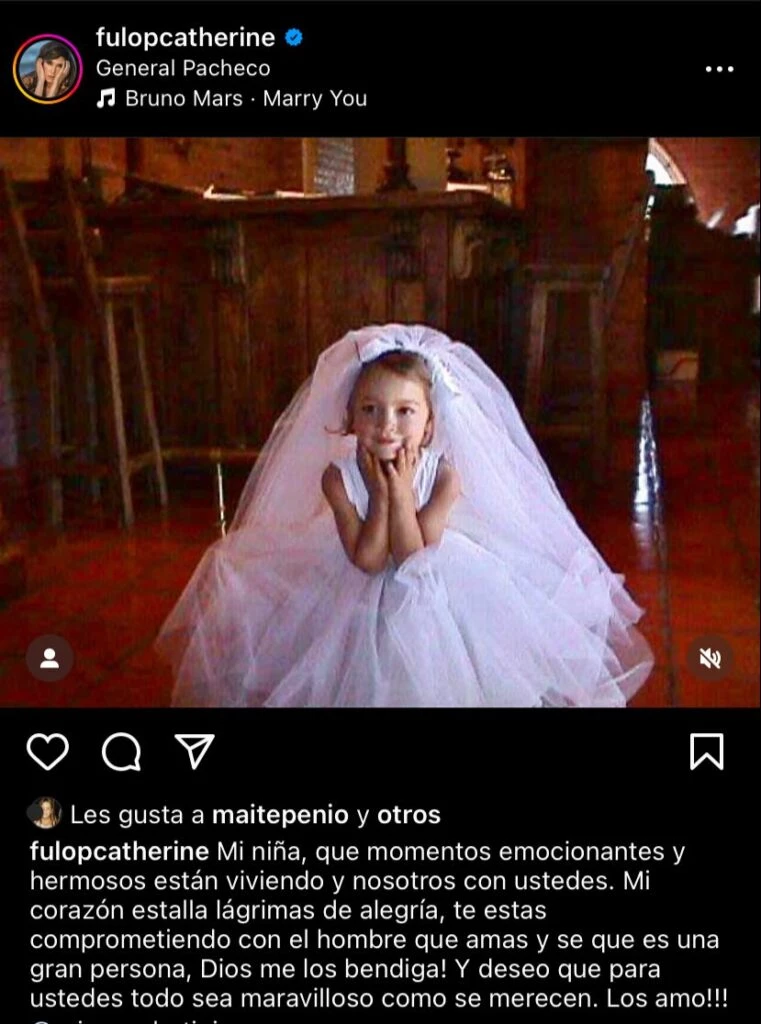 "Mi niña, que momentos emocionantes y hermosos están viviendo y nosotros con ustedes", comenzó con orgullo Catherine Fulop en una publicación junto a una fotografía de ella de niña vestida como novia.