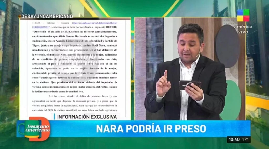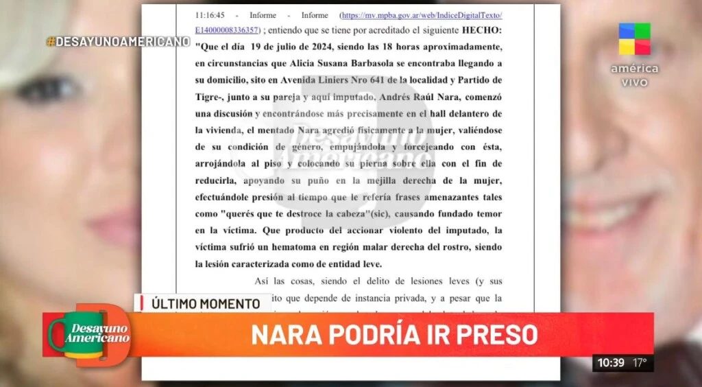 Y, acto seguido, pasó revelar detalles inéditos de la denuncia en cuestión: "Lo que van a leer es lo que ocurrió dentro de la casa. Dice que el día 19 de julio de 2024, siendo las 6 de la tarde aproximadamente, Alicia Barbasola se encontraba llegando a su domicilio. Dice que lo hacía junto a su pareja, el imputado Andrés Nara".