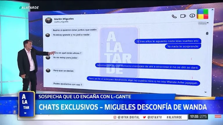 Los chats fueron expuestos por Santiago Sposato, quien mostró mensajes en los que Migueles conversa con una usuaria de Instagram que, según se desprende del intercambio, tendría acceso a la vida cotidiana de la conductora. En esos textos, el empresario intenta averiguar si Wanda mantiene contacto con el cantante y qué tipo de relación tiene con su compañero del reality de cocina.
