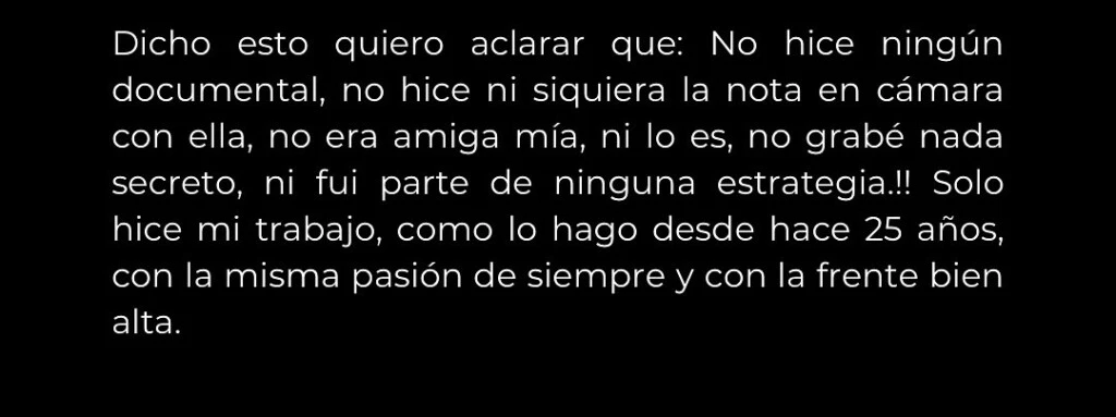 En uno de sus párrafos finales de su extenso descargo, la periodista expresó: "Quiero aclarar que no hice ningún documental, no hice ni siquiera la nota en cámara con ella, no era amiga mía, ni lo es, no grabé nada secreto, ni fui parte de ninguna estrategia. Solo hice mi trabajo, como lo hago desde hace 25 años, con la misma pasión de siempre y con la frente bien alta".