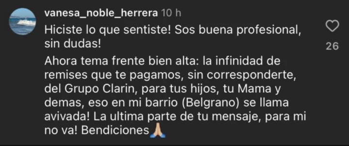 "¡Hiciste lo que sentiste! Sos buena profesional, ¡sin dudas! Ahora tema frente bien alta: la infinidad de remises que te pagamos, sin corresponderte, del Grupo Clarin, para tus hijos, tu mamá y demás, eso en mi barrio (Belgrano) ¡se llama avivada! La última parte de tu mensaje, para mi no va. Bendiciones", comentó Vanesa Noble Herrera en dicho posteo.