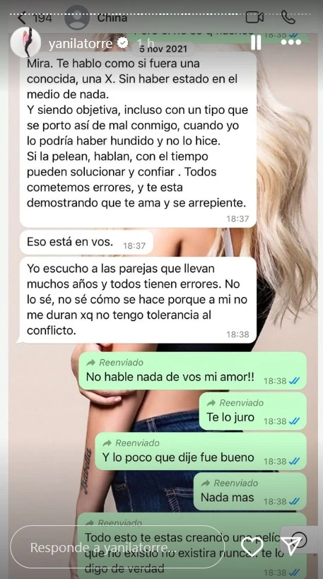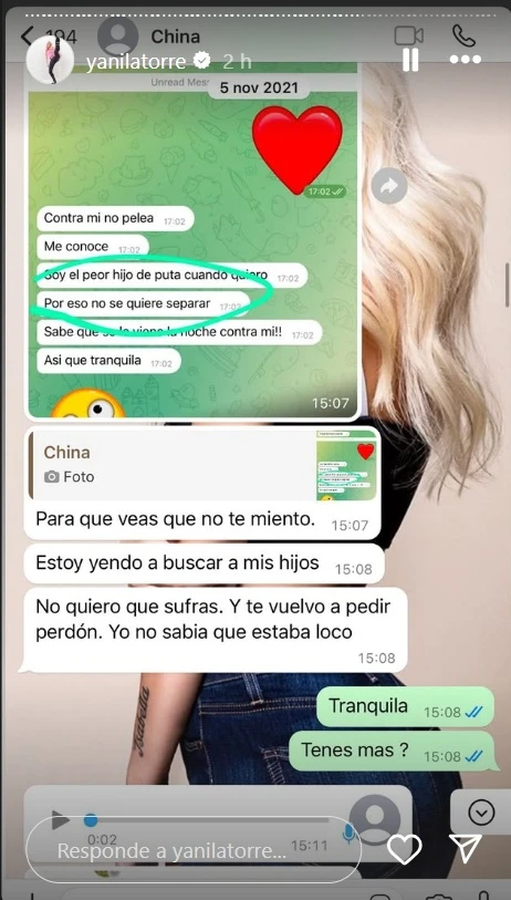 En una de esas historias se puede ver la imagen de un audio de WhatsApp, con el resto del chat en blanco, para no revelar más detalles de la charla. En el audio se la escucha a la China expresando: "A mí lo que me haya dicho o me haya dejado de decir...".