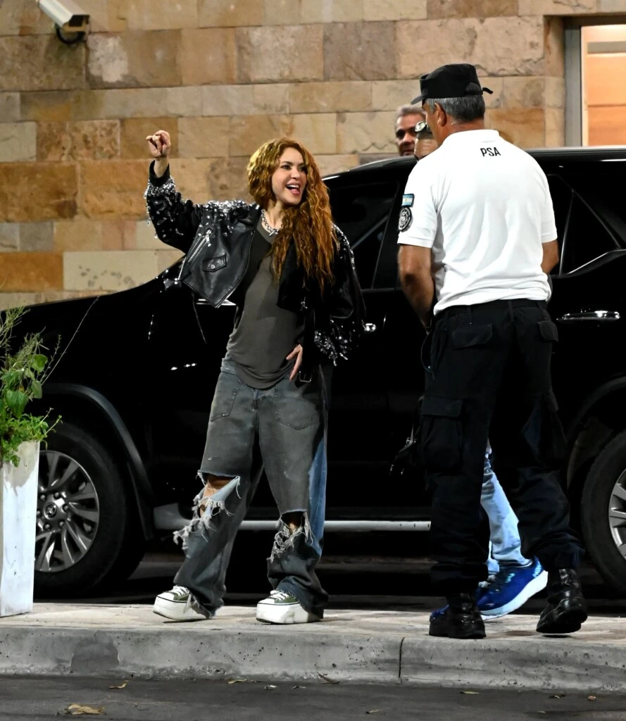 La famosa artista nacida en Barranquilla llegó al país con un look cómodo y descontracturado compuesto por un vaquero overzise, remera negra, campera de cuero customizada con strass y zapatillas urbanas con plataforma.