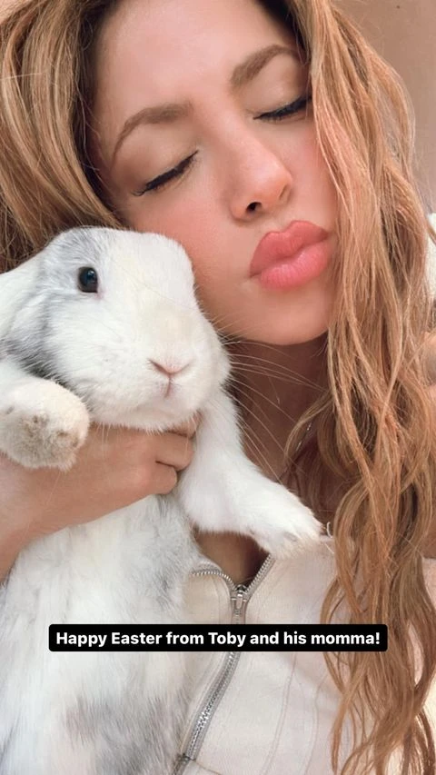 “Felices Pascuas les desea Toby y su mamá”, escribió al pie del posteo Shakira, en el que dejaba ver su cara junto a la de un bonito conejo blanco con manchas grises.