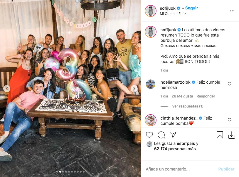 Inmediatamente, junto a muchos saludos "buena onda" –entre ellos de Noelia Marzol, Cinthia Fernández y Yanina Latorre–, la bella modelo se encontró con planteos tales como: "¿Hay que subir esto, Ju? Sos hermosa, pero ahí están todos pegados. Medio cualca"; "Sin barbijos, más de 10 personas y todos pegados"; "Qué lindo, nada de distancia social. Feliz cumple"; "Por culpa de gente así siguen todos los contagios. Sabelo".