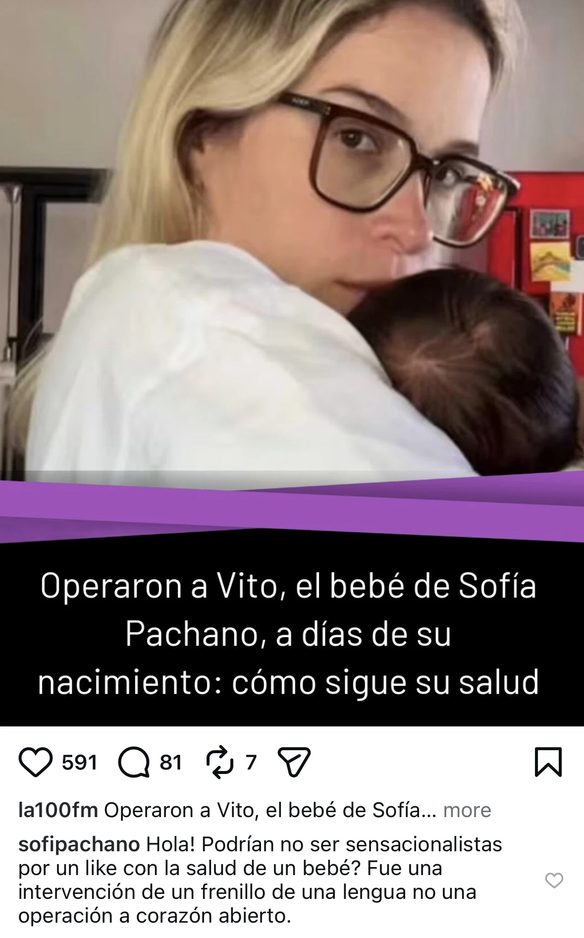Desde su cuenta de Instagram, Sofía fue contundente. “¿Podrían no ser sensacionalistas por un like con la salud de un bebé?”, escribió en los comentarios de una publicación que replicaba el titular. Y agregó una aclaración directa: “Fue una intervención de un frenillo de la lengua, no una operación a corazón abierto”. Con esas palabras, la actriz dejó en claro su malestar por la manera en que se presentó la información.