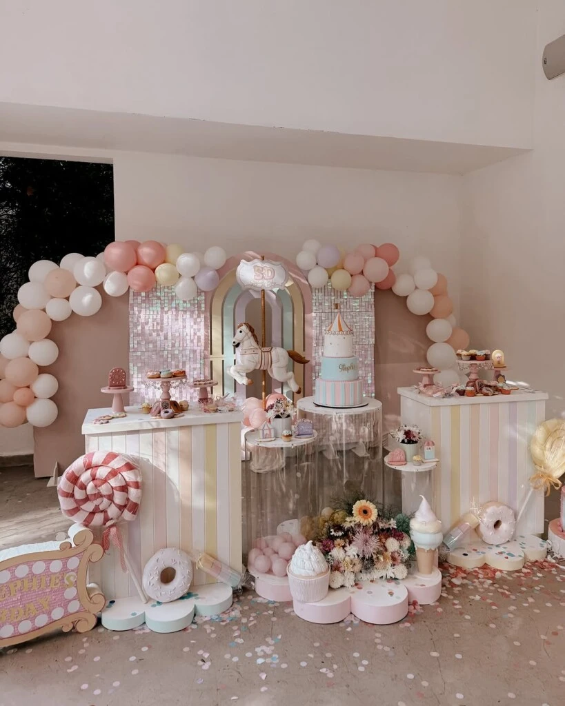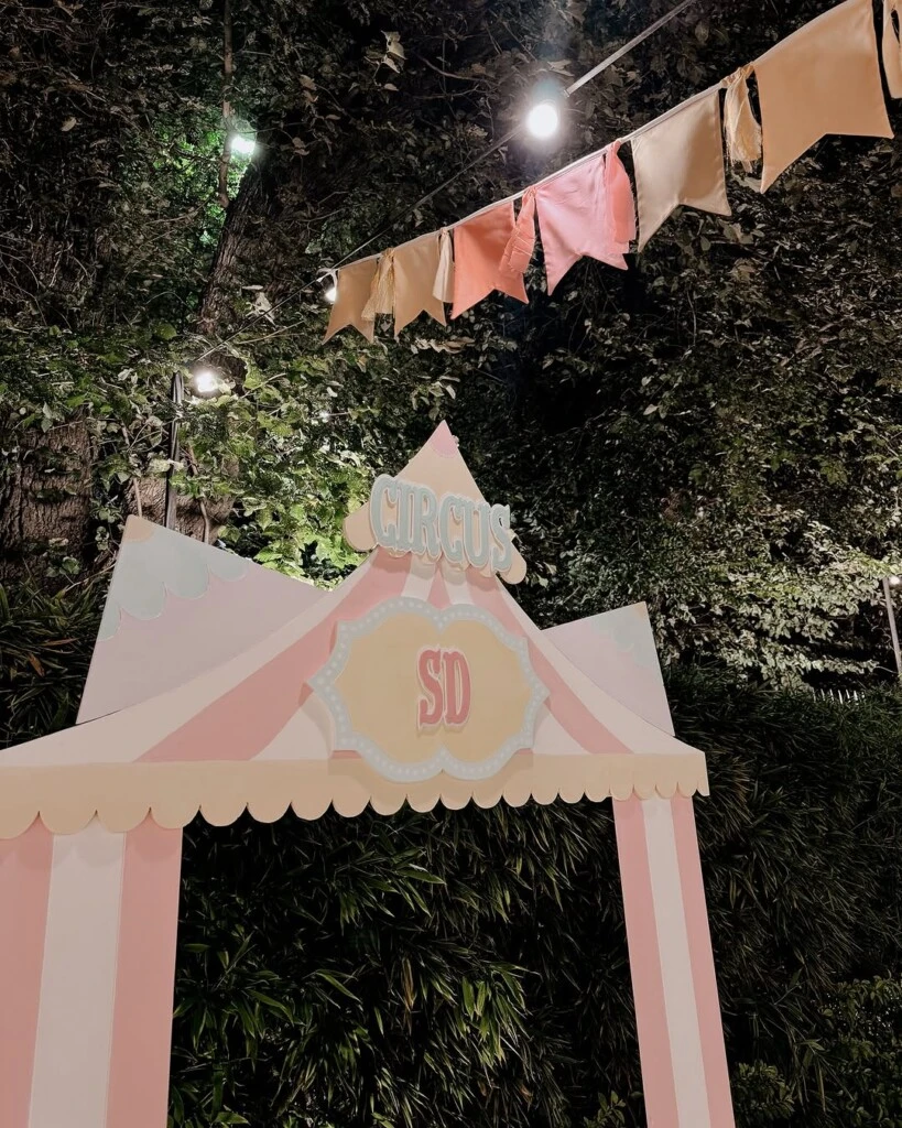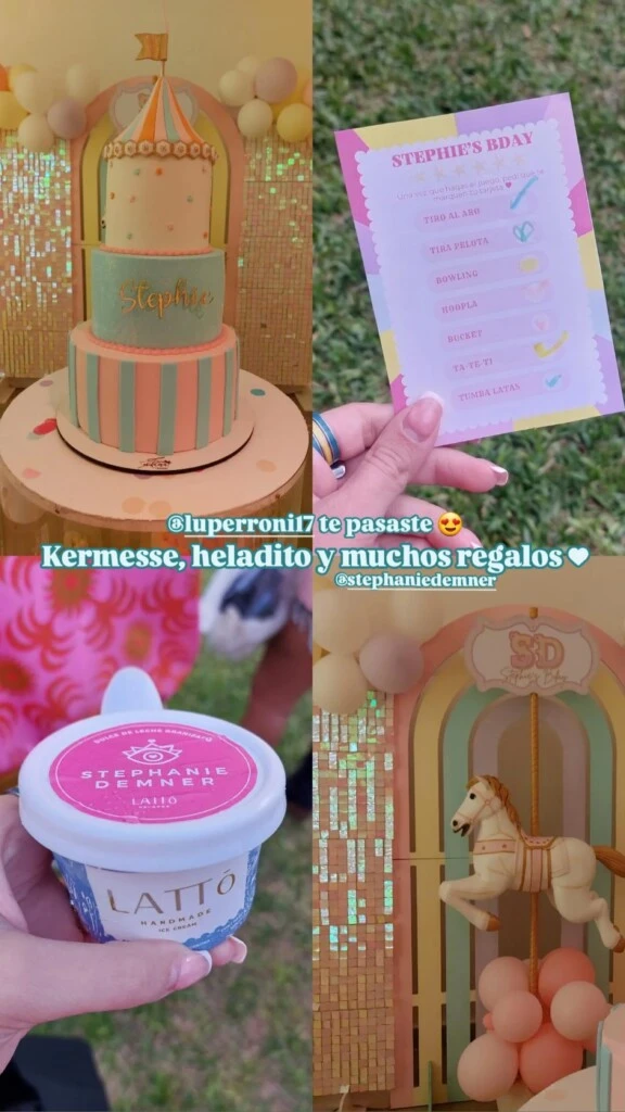 Cuando llegó el momento de la torta, se pudo ver que era de tres pisos, con temática de kermés y colores pasteles. En la parte superior, había un techo de carpa de circo y una banderita dorada, de la que salía la velita. En un costado, sobre el segundo piso, sobresalía un texto que decía 'Stephie'.
