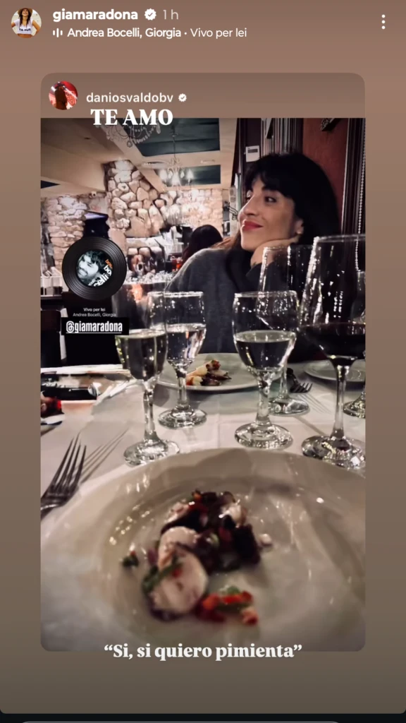 La hija de Maradona que suele ser bastante bajo perfil, reposteó la imagen y confirmó que están atravesando un gran momento, ya que le agregó en mayúsculas: "TE AMO", así como lo que parece ser un chiste entre ellos en medio de la velada: "Si, si quiero pimienta".