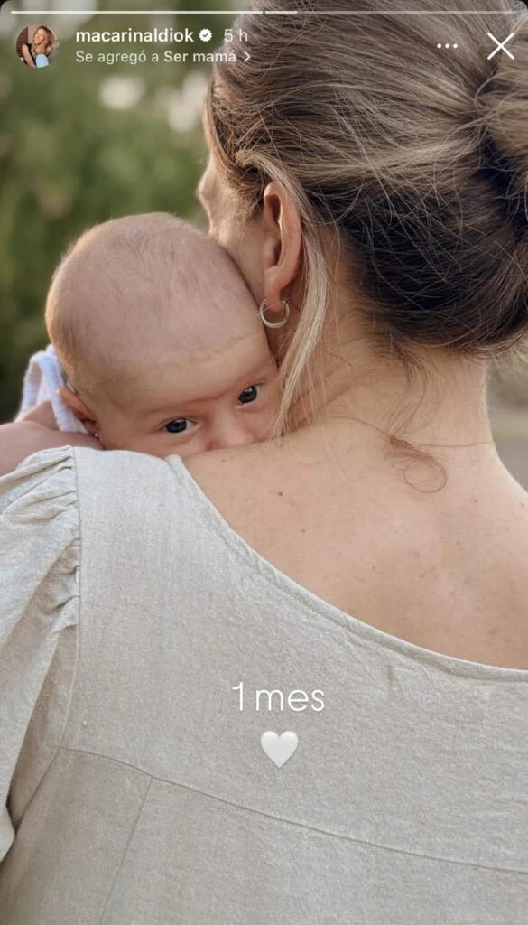 A su vez, Macarena compartió una tierna postal con su hija Amanda, celebrando el primer mes de vida de su bebé. Junto a una foto en la que se la veía a la bailarina de espaldas, sosteniendo a su hija en brazos, y se llegaba a ver parte de la carita de Amanda, escribió "1 mes" y agregó un corazón blanco.