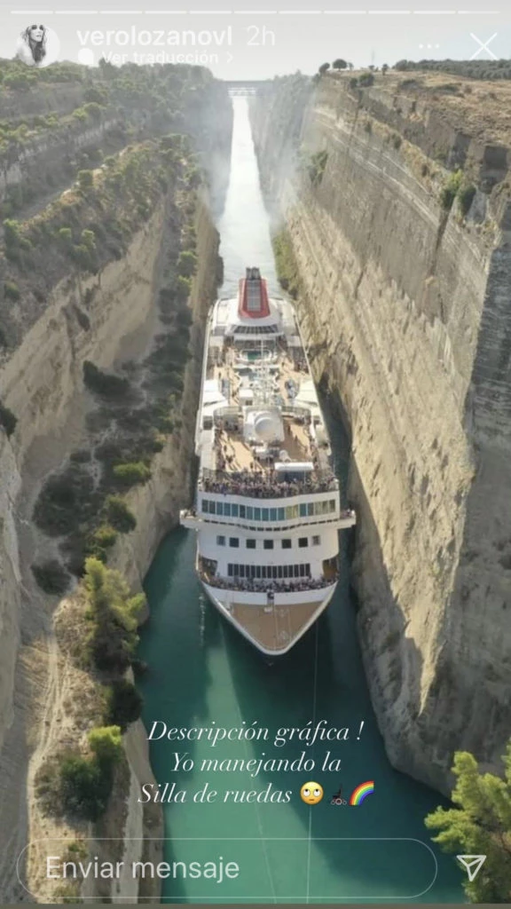 En la foto se ve un enorme barco pasando por un angosto pasaje en el mar. "Descripción gráfica: Yo manejando la silla de ruedas", escribió Lozano y dejó muy claro cómo se siente en esta situación actual.